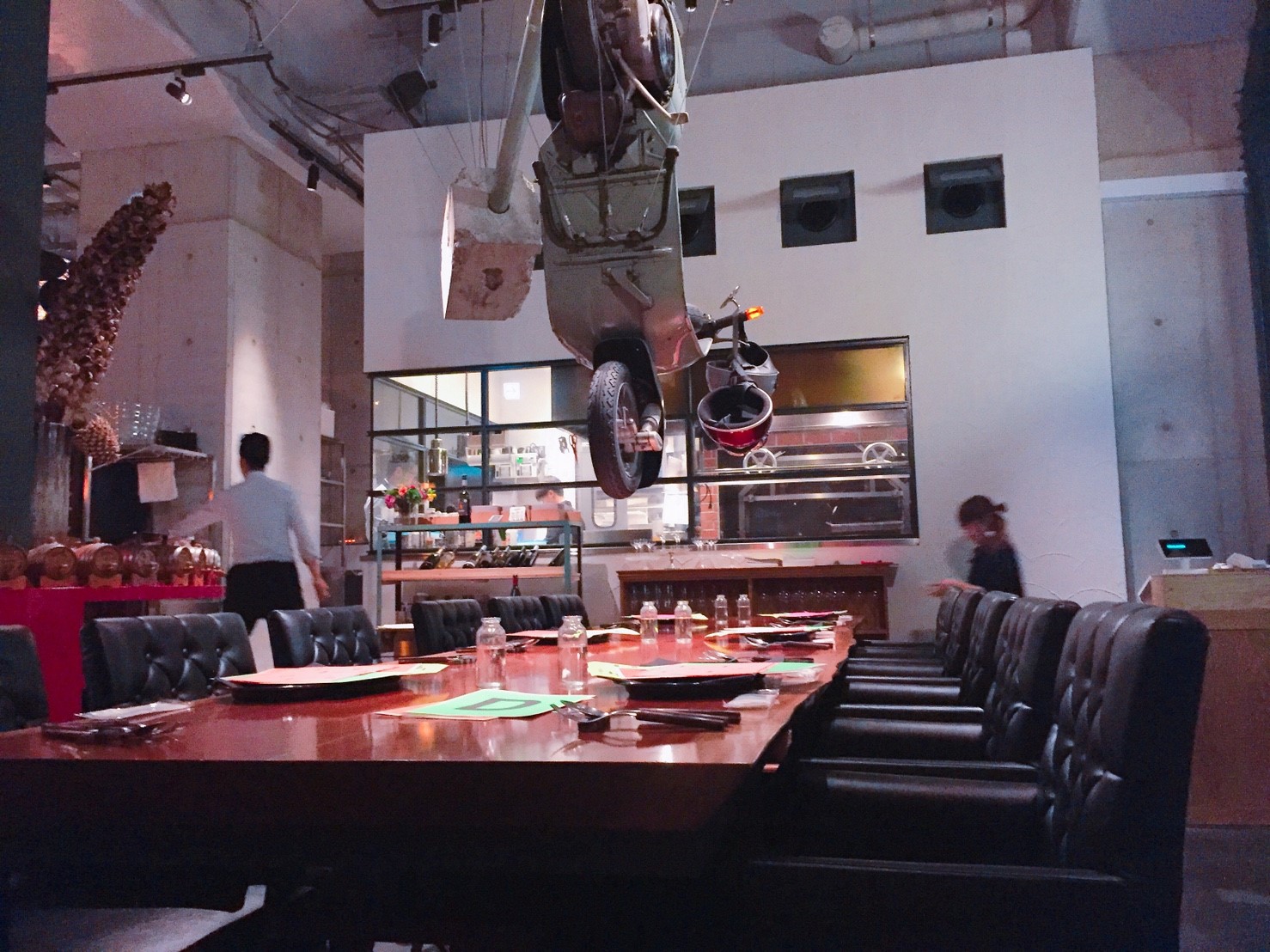 店内は天井が高く、すぐに吊り下げられたバイクが目に入ります。